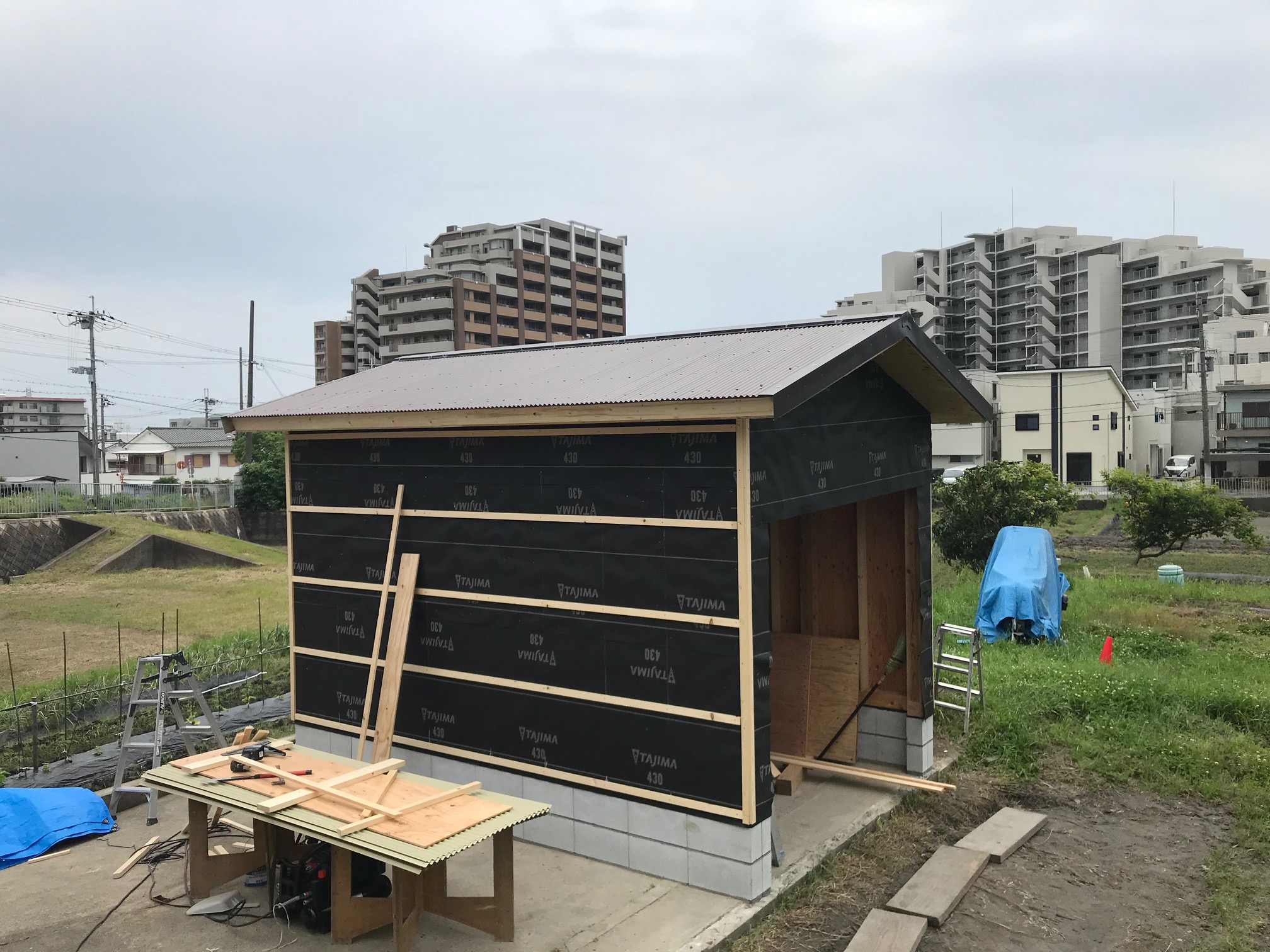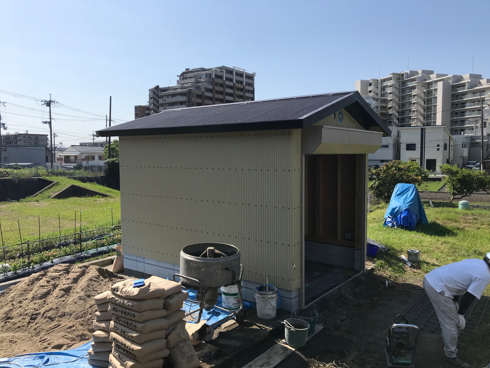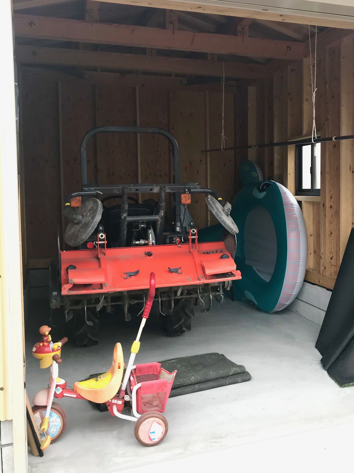 トラクター用の格納庫を建替えました。 ライトキャメル色の外壁を採用したことにより、トラクターと三輪車という親子が帰る家のような やわらかでメルヘンチックな建物になりました。